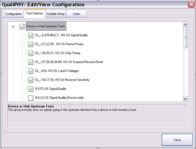 QualiPHY軟件支持用戶可定制化測(cè)試項(xiàng)目,可以選擇單個(gè)或多個(gè)項(xiàng)目分別測(cè)試,從而大大提高了靈活性。圖2描述的是USB2.0 High Speed的Device or Hub測(cè)試項(xiàng)目定制窗口。