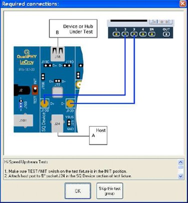 QualiPHY軟件的用戶界面設(shè)計(jì)非常人性化和直觀實(shí)用,它會(huì)以圖表化的方式顯示出一致性測(cè)試的每個(gè)環(huán)節(jié)中測(cè)試夾具、示波器主機(jī)和DUT三者之間的拓?fù)潢P(guān)系,使用者無需記憶,就能正確設(shè)置測(cè)試環(huán)境。下圖4清晰 顯示了USB2.0高速設(shè)備信號(hào)質(zhì)量測(cè)試中的夾具、DUT和示波器連接關(guān)系。