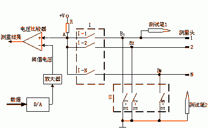 實(shí)現(xiàn)自動(dòng)測(cè)量的前提是將被測(cè)元件引腳連入探測(cè)電路中,為此探測(cè)設(shè)備設(shè)置若干個(gè)測(cè)量頭,通過(guò)電纜引出,測(cè)量頭可掛接各種測(cè)試夾具與元件引腳建立連接,測(cè)量頭的數(shù)量決定了同一批連入探測(cè)電路的引腳數(shù)。然后在程序控制下探測(cè)儀按組合原則依次將被測(cè)"引腳對(duì)"一一納入測(cè)量通路。在測(cè)量通路中將"引腳對(duì)"之間的通/斷路狀況呈現(xiàn)為引腳間有無(wú)電阻,測(cè)量通路將其轉(zhuǎn)換為一個(gè)電壓量,由此判斷它們之間的通/斷路關(guān)系并加以記錄。