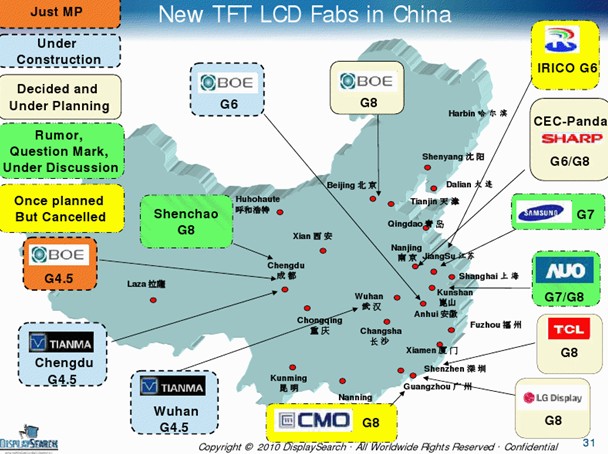 市場方面,隨著面板價格上揚、終端銷售成績比預期理想、中國家電下鄉(xiāng)及以舊換新政策的實施等,整個FPD產(chǎn)業(yè)景氣似乎已然復蘇,天馬、夏普、三星、LG等廠商陸續(xù)開始在大陸建立新生產(chǎn)線或重新啟動停產(chǎn)產(chǎn)能。