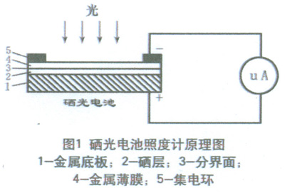 測量照度的儀器是照度計(jì),或稱勒克斯計(jì)。照度計(jì)通常是由硒光電池或硅光電池和微安表組成,見圖1。硒光電池是把光能直接轉(zhuǎn)換成電能的光電元件。當(dāng)光線射到硒光電池表面時(shí),入射光透過金屬薄膜4到達(dá)半導(dǎo)體硒層2和金屬薄膜4的分界面上,在界面上產(chǎn)生光電效應(yīng)。產(chǎn)生電位差的大小與光電池受光表面上的照度有一定的比例關(guān)系。這時(shí)如果接上外電路,就會有電流通過,電流值從以勒克斯(Lx)為刻度的微安表上指示出來。光電流的大小取決于入射光的強(qiáng)弱和回路中的電阻。照度計(jì)有變檔裝置,因此可以測高照度,也可以測低照度。