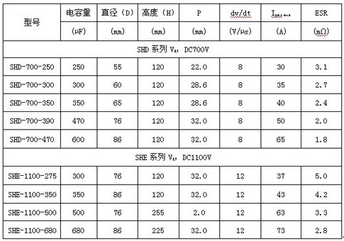 由于三相橋式整流器的電容器濾波實(shí)際上是直流支撐、DC-Link或直流母線旁路電容器。這樣問題關(guān)鍵就是“濾波”電容器的電流承受能力是否滿足要求。薄膜電容器制造商已經(jīng)制造出相應(yīng)的金屬化聚丙烯薄膜電容器。EACO的SHD系列DC-Link單面金屬化聚丙烯薄膜電容器的數(shù)據(jù)如表1所示。