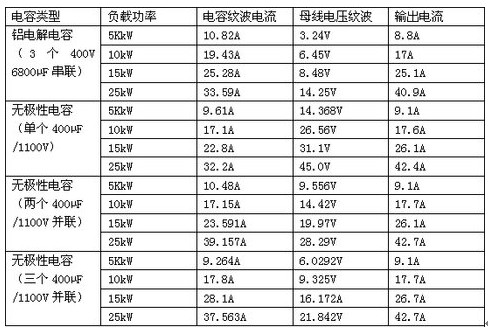 第三個(gè)替換試驗(yàn)是用薄膜電容器替代660V交流輸入電壓變頻器中的鋁電解電容器。由于手頭沒有660V感應(yīng)電機(jī),負(fù)載只能采用電阻箱替代感應(yīng)電機(jī)。其測試結(jié)果列于表3。
