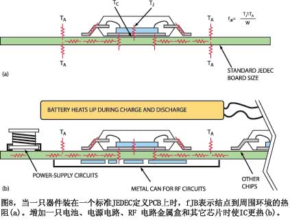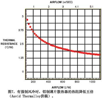 對(duì)流散熱也有一些困難。例如,氣流對(duì)商用散熱片的影響(圖7)。注意,在高溫下,熱阻會(huì)增加五倍。使用強(qiáng)制風(fēng)冷的散熱片有較薄、間距更近的鰭片,比如一款風(fēng)扇式CPU冷卻器。如果你的產(chǎn)品沒(méi)有風(fēng)扇,則IC產(chǎn)生的熱量會(huì)傳導(dǎo)和散播出來(lái),然后傳送到機(jī)內(nèi)的空氣中。接下來(lái),隨著整個(gè)機(jī)器溫度的上升,熱量通過(guò)對(duì)流傳送給周?chē)目諝?,如果你把機(jī)器放在腿上,則部分熱量也會(huì)傳導(dǎo)過(guò)來(lái)。外殼材料的熱阻就變得很重要。熱量從內(nèi)向外的傳送速度,塑料殼要慢于金屬殼。