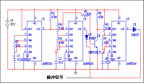 充電電路與脈沖信號結合,對電路進行充電。這里的脈沖信號可用555定時器來實現(xiàn),用3個555來構成一個頻率在周期變化的脈沖信號。電路圖如圖。