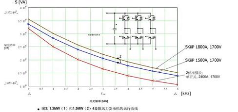 兩個(gè)單管模塊將提供一個(gè)2.4kA的半橋。比較計(jì)算的結(jié)果可以看到,與放置在最大外殼中的標(biāo)準(zhǔn)模塊相比,采用SKiiP的方案可在整個(gè)開(kāi)關(guān)頻率范圍內(nèi)提供更高的輸出電流。可用逆變器輸出功率與開(kāi)關(guān)頻率的關(guān)系見(jiàn)圖3。