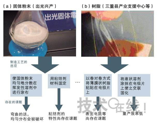 出光興產(chǎn)數(shù)年前就在開發(fā)用于固體電解質(zhì)的粉末狀“硫化物類鋰鹽”(出光興產(chǎn))的全固體鋰離子充電電池。最近的進(jìn)展主要有兩點:①尺寸從名片大小加大到了A6大小,②省去了以前輸出功率時所需要的數(shù)kgf/cm2壓力。不過,目前還存在彎曲性和電解質(zhì)均一性的課題,需要進(jìn)一步改進(jìn)制造工藝(圖1)。