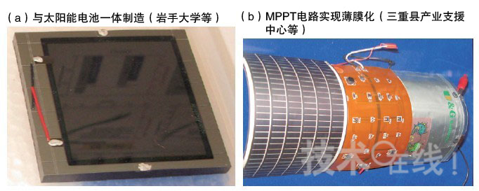 (b)為三重縣產(chǎn)業(yè)支援中心等的開發(fā)示例,與太陽能面板、最大功率點跟蹤(MPPT)電路,以及鋰聚合物充電電池進(jìn)行了組合。