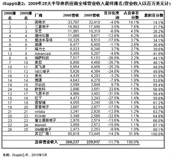 表2所示為iSuppli公司對2009年全球半導(dǎo)體廠商營業(yè)收入的最終排名。