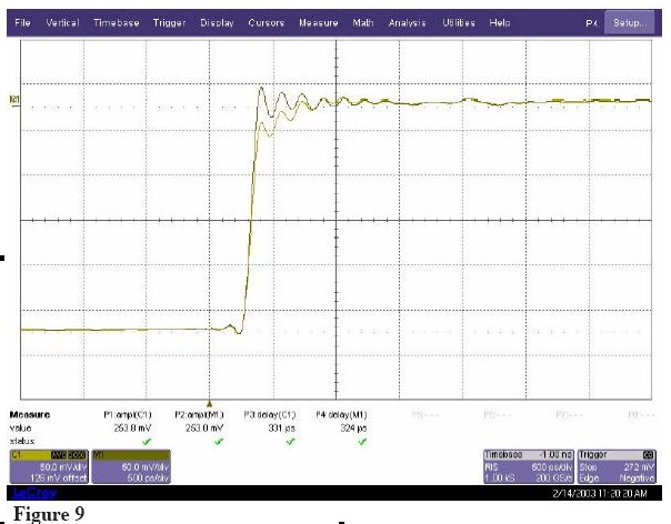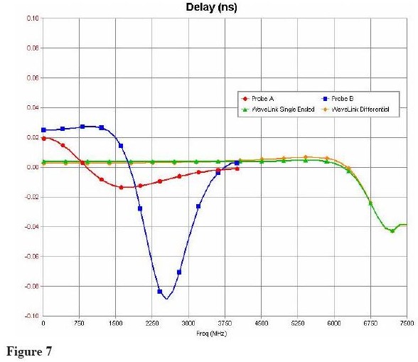 新的WaveLinks探頭不通過同一個(gè)測試信號,測量結(jié)果如Figure 10 所示。由于探頭負(fù)載(<1%)信號幅度有輕微的減少,但主要的信號邊沿完全沒有失真。探頭阻抗產(chǎn)生的延遲是2ps,不會隨著信號頻率改變。