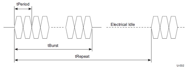 測(cè)量了Polling.LFPS信令的電壓和時(shí)間參數(shù),在USB3.0規(guī)范CTS Rev0.9中是必測(cè)項(xiàng)目。測(cè)試方法為:待測(cè)試產(chǎn)品(PUT)的端口上插入U(xiǎn)SB3.0夾具,夾具上的TX端通過(guò)同軸電纜連接到示波器的兩個(gè)通道,將PUT上電后,PUT會(huì)發(fā)送出Polling.LFPS信令,示波器捕獲后測(cè)量其水平或垂直參數(shù)。如圖3所示為L(zhǎng)FPS的信號(hào)特征。在力科一致性測(cè)試軟件中會(huì)分析脈沖的上升、下降時(shí)間、周期、占空比、峰峰值、共模電壓,以及脈沖串的突發(fā)持續(xù)時(shí)間(tBurst)和重復(fù)時(shí)間(tRepeat)。