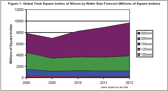 圖1所示為iSuppli公司對2008-2013年硅片面積總產(chǎn)量的預(yù)測,按晶圓尺寸細分。