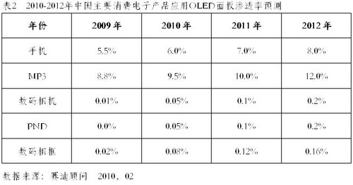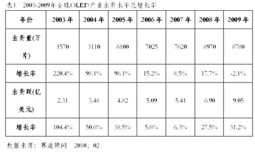 2010年4月13日,中國(guó)權(quán)威ICT研究與管理咨詢機(jī)構(gòu)賽迪顧問股份有限公司在“2010中國(guó)消費(fèi)電子市場(chǎng)年會(huì)”上發(fā)布《2009-2010年中國(guó)OLED產(chǎn)業(yè)發(fā)展研究年度報(bào)告》顯示:隨著手機(jī)和MP3/MP4等應(yīng)用產(chǎn)品需求的推動(dòng),OLED顯示屏市場(chǎng)自2003年開始快速成長(zhǎng),到2009年,全球OLED出貨量達(dá)到8780萬片,由于受到全球終端產(chǎn)品有所減緩的影響,特別是手機(jī)和MP3市場(chǎng)出貨量的下滑,加上PMOLED全球產(chǎn)量明顯降低,但AMOLED在得到面板廠商大力推動(dòng)下,特別是像諾基亞、三星、索愛等終端廠商,均在2009年推出一系列采用AMOLED屏幕的手機(jī),在應(yīng)用市場(chǎng)的推動(dòng)下,AMOLED有了較大的增長(zhǎng),不過OLED總體仍有所下滑。伴隨著AMOLED出貨量的增長(zhǎng)和市場(chǎng)比例的提升,OLED整體產(chǎn)值有明顯的增長(zhǎng),2009年產(chǎn)值達(dá)到9.05億美元,較2008年成長(zhǎng)31.2%,出貨量在下滑的同時(shí),而出貨額保持增長(zhǎng),AMOLED貢獻(xiàn)極為明顯。