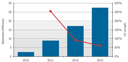隨著主要電視品牌廠商開始在商場(chǎng)銷售3D電視及有愈來愈多關(guān)于3D產(chǎn)品計(jì)劃的進(jìn)行,DisplaySearch將2010年3D電視出貨量提高到250萬臺(tái),同時(shí)3年后3D電視市場(chǎng)將會(huì)有非常驚人的發(fā)展,預(yù)估到2013年將超過2千7百萬臺(tái)出貨。圖一為2010到2013年間3D電視出貨量預(yù)測(cè)。