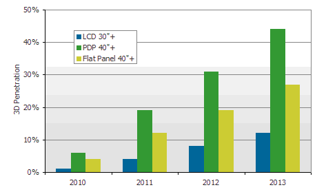 Paul指出3D電視剛開始以大尺寸產(chǎn)品為主,同時(shí)需要結(jié)合如藍(lán)光DVD與3D數(shù)字廣播系統(tǒng)等才有機(jī)會(huì)引發(fā)消費(fèi)者購買,因此預(yù)估今年主要出貨將以北美市場(chǎng)為主,北美將占有全球超過50%出貨量。另外與其它機(jī)種比較,具備3D功能的影像處理器與增加顯示功能方案成本都非常昂貴,也因此3D市場(chǎng)成長將受限于倍頻與雙倍頻機(jī)種的滲透率。DisplaySearch預(yù)估到了2013年3D電視占所有40寸及以上尺寸電視出貨量比率將僅有27%。除了成本因素外,西歐地區(qū)目前藍(lán)光DVD與高清播放系統(tǒng)滲透率仍低,如此一來對(duì)于3D內(nèi)容提供形成一定障礙,也對(duì)于3D電視成長造成一些影響。