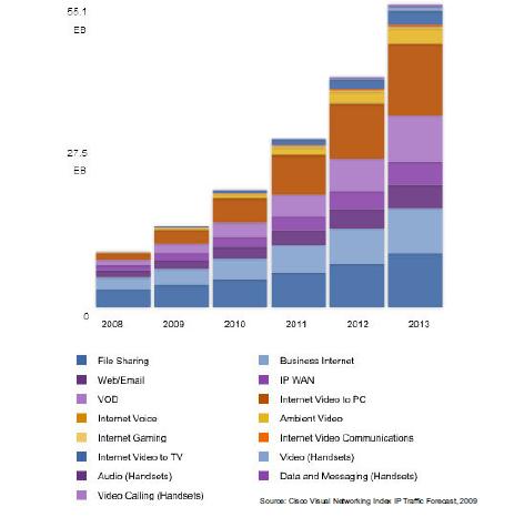 如圖1所示,從2007年到2012年,IP總流量將增加6倍,幾乎每?jī)赡昃头丁?012年之前,流量每年增長(zhǎng)522exabytes(1018,即zettabyte的一半)。這種指數(shù)增長(zhǎng)的主要推動(dòng)力量是高清晰視頻和高速寬帶消費(fèi)類(lèi)應(yīng)用。