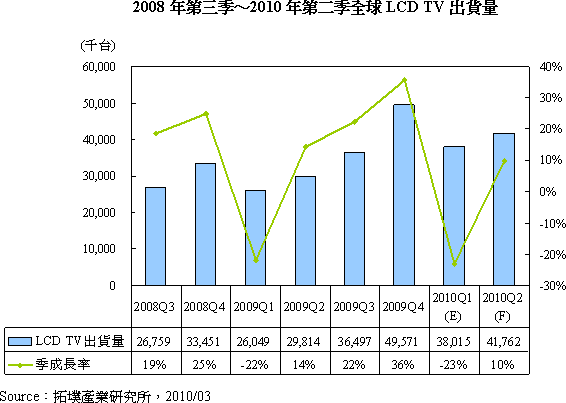 每年第一季歐美地區(qū)普遍缺乏節(jié)日刺激銷售,因此當(dāng)季全球LCD TV出貨量往往呈現(xiàn)衰退狀況。雖然業(yè)界期望中國春節(jié)能改變第一季衰退的命運(yùn),但2010年春節(jié)中國市場LCD TV銷售量僅214萬臺,遠(yuǎn)低于各界預(yù)估的400萬臺。拓墣產(chǎn)業(yè)研究所張乘維經(jīng)理估計,2010年全球LCD TV首季出貨量僅3,802萬臺,較2009年第四季下滑23%。