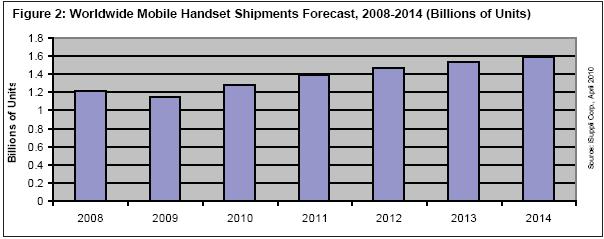 圖2所示為iSuppli公司對(duì)2008-2014年全球手機(jī)出貨量的預(yù)估。