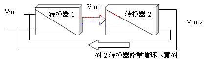 要實現(xiàn)節(jié)能循環(huán)利用,主要考慮將消耗在電阻負載上的能量更加合理的利用。如果能將輸出電壓Vout再還原為輸入電壓Vin,則輸出電能轉(zhuǎn)換為輸入的電能,便可以實現(xiàn)電能的循環(huán)利用,如圖2所示:將原有轉(zhuǎn)換器的電阻負載R1用等效輸入阻抗的轉(zhuǎn)換器2取代,轉(zhuǎn)換器2的輸出接轉(zhuǎn)換器1的輸入。則與R1等效輸入阻抗的轉(zhuǎn)換器2從轉(zhuǎn)換器1輸出端消耗的能量被轉(zhuǎn)換到轉(zhuǎn)換器1的輸入端,再經(jīng)轉(zhuǎn)換器1又到轉(zhuǎn)換器2的輸入端,實現(xiàn)了能量的循環(huán)利用。如果在理想情況下,沒有轉(zhuǎn)換損耗,則系統(tǒng)可以自循環(huán)工作。當然這是無法實現(xiàn)的,所以在能量分析時,要引入轉(zhuǎn)換過程的消耗。