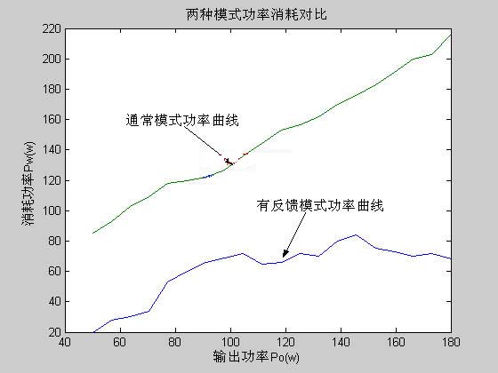 結(jié)果分析:在通常工作模式情況下,曲線的波動是由于電能轉(zhuǎn)換器的轉(zhuǎn)換效率影響造成的,由前面原理分析可知消耗功率為Pi=Po+Pw,如果轉(zhuǎn)換效率為,則Pi=Po/η,轉(zhuǎn)換效率η通常隨著輸出功率的變化有一定的波動,所以曲線的波動符合理論分析;在有反饋的工作模式情況下,由前面原理分析部分得系統(tǒng)的消耗功率為Pi=Pw+Pwf,分別設(shè)轉(zhuǎn)換器1的轉(zhuǎn)換效率為η1,反饋部分的轉(zhuǎn)換效率為η2,則系統(tǒng)的消耗功率為: