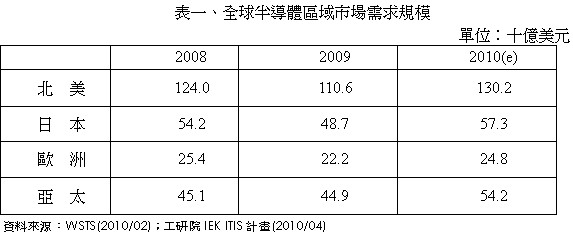 2009年全球半導(dǎo)體市場僅北美地區(qū)微幅成長1.7%,其他皆呈現(xiàn)負(fù)成長:亞太市場衰退3.5%,歐洲市場衰退21.9%,日本市場衰退21.0%。不景氣使得下游電子產(chǎn)品品牌大廠,如Dell、HP、Sony等廠商增加產(chǎn)品委外代工之比例,以降低生產(chǎn)成本,增加其產(chǎn)品競爭力。因此,2009年主要從事代工生產(chǎn)之亞太地區(qū),才會出現(xiàn)僅小幅衰退之情形。至于北美地區(qū)則是因為受到下游品牌廠商降價促銷成功,使得市場呈現(xiàn)小幅成長。