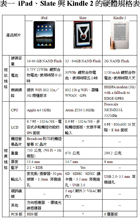 平板電腦iPad、Slate以及電子書閱讀器Kindle 2的硬體規(guī)格表如表一所示,從此表的硬體規(guī)格資料中,我們可以得知,iPad、Slate和Kindle 2采用的硬體規(guī)格有其相似處,也有其相異之處。