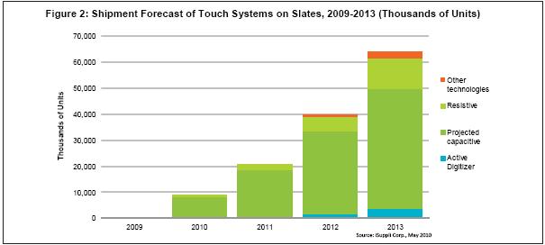 最近幾年,個(gè)人電腦市場(chǎng)對(duì)于觸摸屏的需求不斷增長(zhǎng),2008和2009年增長(zhǎng)率超過(guò)20%,快于總體系統(tǒng)市場(chǎng)。但與該市場(chǎng)2010年462%的增長(zhǎng)率相比,上述增長(zhǎng)速度就相形見絀了。平板觸摸電腦是PC觸摸革命中的主要初期推動(dòng)者,預(yù)計(jì)占PC觸摸市場(chǎng)的比例將從2009年的3.8%銳升到56.2%,而總體PC觸摸市場(chǎng)規(guī)模將擴(kuò)大兩倍。