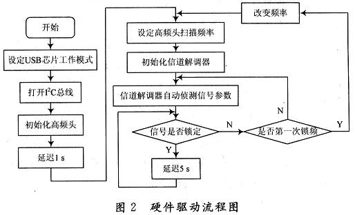 硬件驅動程序是系統(tǒng)設計中很關鍵的一個部分,它直接關系到各硬件芯片是否能正常穩(wěn)定的工作。硬件的驅動是由主控芯片來完成,在本方案中將uSB傳輸控制芯片CY7C68013作為主控芯片,它內置增強型的8051內核,通過I2C總線來控制前端的高頻頭和信道解調芯片,完成對前端的驅動。
