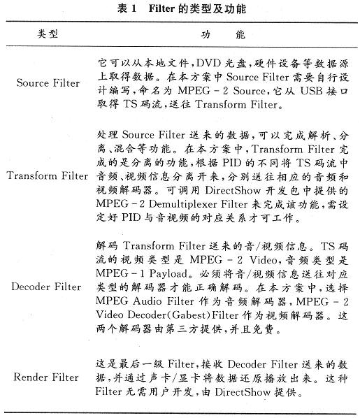 軟件方面,PC機端應用程序的核心部分是實時播放器,需要播放的是TS碼流,這是MPEG-2標準定義的一種碼流。本方案采用基于DirectShow技術搭建的媒體播放器。DirectShow是DirectX家族中的成員,它為在Windows平臺上處理各種格式的多媒體文件的回放、音視頻采集等高性能要求的多媒體應用提供了完整的解決方案,重要的是它很好地支持了MPEG-2標準,它使應用程序開發(fā)人員從復雜的數據傳輸、硬件差異、同步性等工作解脫出來,總體應用框架和底層工作由DirectShow來完成,大大加快了開發(fā)進度。