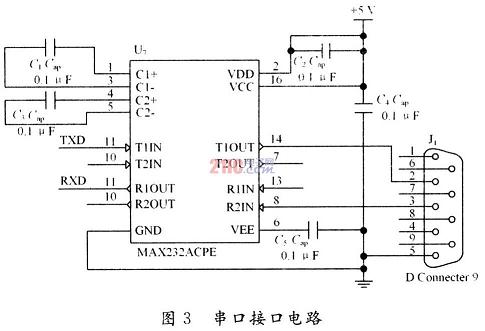 RS232標(biāo)準(zhǔn)是美國電子工業(yè)聯(lián)合會(EIA)制定的一種串行物理接口標(biāo)準(zhǔn),它適合于數(shù)據(jù)傳輸率在O~20000b/s范圍內(nèi)的通信,目前廣泛用于計算機(jī)與終端或外設(shè)之間的近端連接。實(shí)際工作時,應(yīng)保證電平在5~15V之間。所以為了與單片機(jī)進(jìn)行通信。必須對其電平進(jìn)行轉(zhuǎn)換?,F(xiàn)在常用的轉(zhuǎn)換芯片是MAX232。MAX232內(nèi)部有電壓倍增電路和轉(zhuǎn)換電路,只需5V電源便可實(shí)現(xiàn)TTL電平與RS232電平的轉(zhuǎn)換,使用十分方便。串口接口電路如圖3所示。