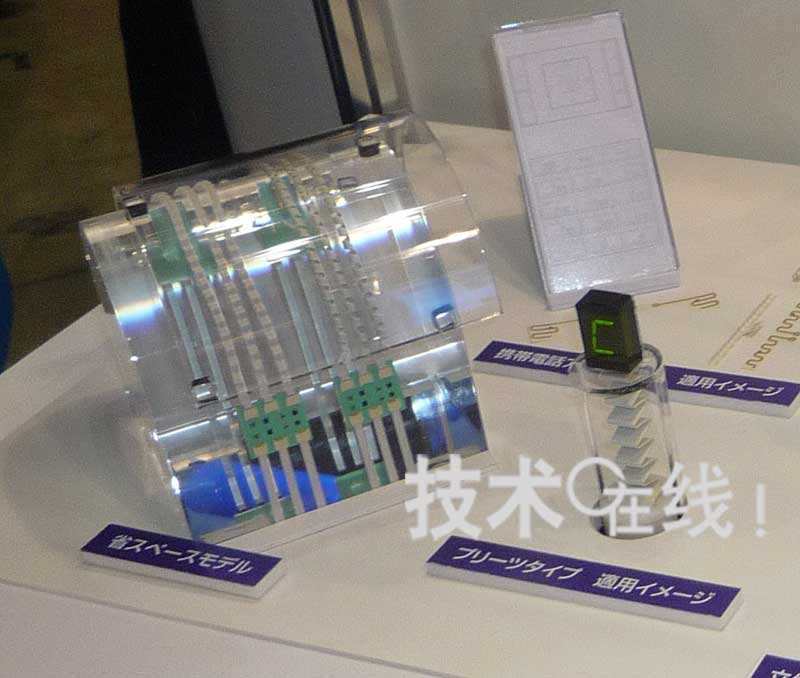 此外,還展示了將底板制成與設(shè)備縫隙一致的形狀,從而易于封裝并可有效利用縫隙的實(shí)例。展出了將封入了天線的底板切成圓形,以及與手機(jī)外殼形狀相同的底板。