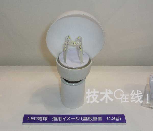 作為應(yīng)用立體布線的例子,Mectron還展出了LED燈泡的試制品。通過(guò)在立體底板上封裝朝向多個(gè)方向的LED模塊,可以擴(kuò)大光照射范圍。如果在布線層之外再加上散熱用厚銅箔,則LED模塊散熱也會(huì)變得很容易。