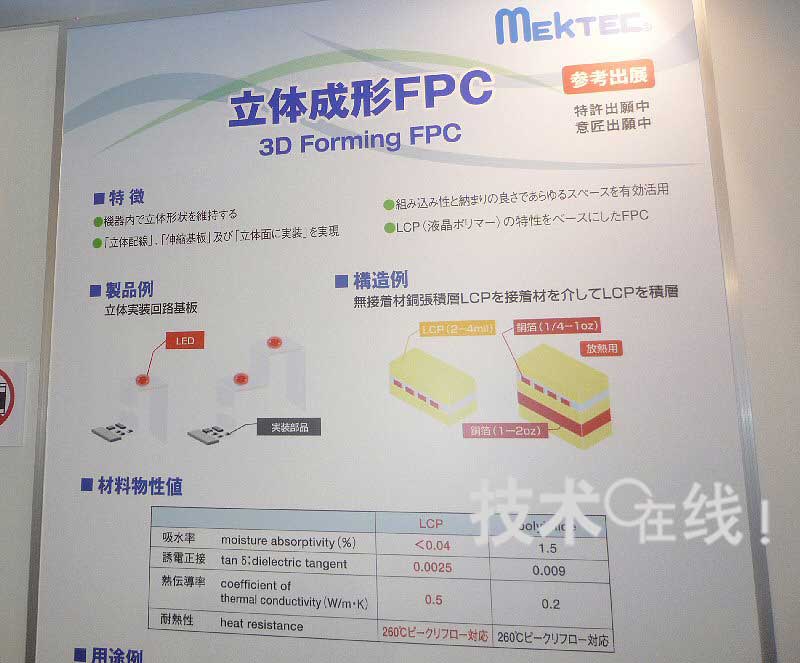 日本Mectron可立體成型的柔性底板“立體成型FPC”在“JPCA Show 2010”(2010年6月2~4日)上參考展出。該底板由熱可塑性液晶聚合物和銅箔構(gòu)成,形成希望的構(gòu)造并加熱后冷卻,可以保持其形狀。預(yù)定在2010年度內(nèi)完成技術(shù)開(kāi)發(fā),2011年度開(kāi)始量產(chǎn)。
