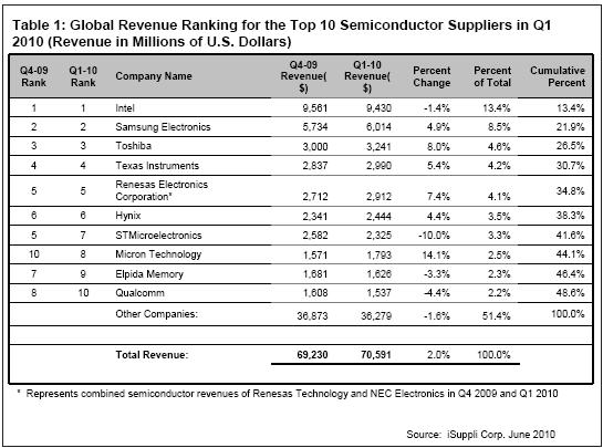 在全球排名前10的半導(dǎo)體供應(yīng)商中,2010年第一季度有六家銷售收入高于2009年第四季度。表1所示為iSuppli公司對2010的第一季度全球10大半導(dǎo)體供應(yīng)商的排名。