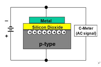 當(dāng)偏壓降低時(shí),多數(shù)載流子從氧化層界面被排斥開,耗盡區(qū)形成。當(dāng)偏壓反相時(shí),電荷載流子遠(yuǎn)離氧化層達(dá)到最大距離,電容達(dá)到最小值(即d為最大值)。根據(jù)這時(shí)的反型區(qū)電容,可以推算出多數(shù)載流子的數(shù)量。這一基本原理同樣適用于MOSFET晶體管,只是它們的物理結(jié)構(gòu)和摻雜更加復(fù)雜。