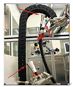 對于潔凈室環(huán)境來說,電纜拖鏈中的電纜集塵是一個復雜的問題。為了盡量減少集塵,需要盡可能地避免電纜以及套管之間的摩擦。盡管通過減少運動器件可以減少集塵,但是自動生產(chǎn)線上電纜的運動不可避免。另外,用于分隔圓形電纜和套管的分隔片和支架是產(chǎn)生集塵的另一個因素。如果不使用分隔片,或者分隔片沒有正確的安裝,電纜以及套管之間的摩擦將導致這些部件的蠕變、移動或扭曲,這樣就會增加集塵。