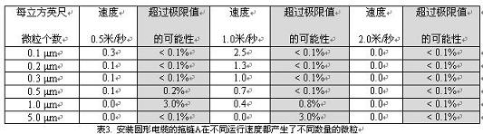 安裝圓形電纜的拖鏈A在不同運行速度都產(chǎn)生了不同數(shù)量的微粒(見表3)。按照VDIGuideline2083和ISO14644-1標準,鑒定這種電纜拖鏈/電纜裝置產(chǎn)生集塵的可能性是3%。