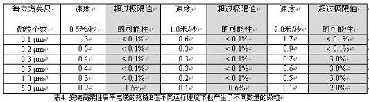 安裝高柔性扁平電纜的拖鏈B在不同運行速度下也產(chǎn)生了不同數(shù)量的微粒(見表4)。按照VDIGuideline2083和ISO14644-1標準,鑒定這種電纜拖鏈裝置產(chǎn)生集塵的可能性是3%。