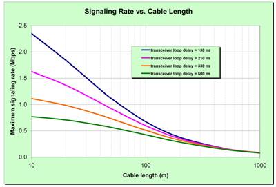 下面顯示了信號速率和線纜長度之間的權(quán)衡因素,以及收發(fā)器延遲帶來的影響。收發(fā)器帶來的延遲(包括相關(guān)隔離、電平轉(zhuǎn)換和保護)對于500kbps及以上的信號速率特別明顯。