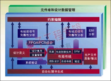 圖1表明了一個典型的由前端到后端的綜合系統(tǒng)設(shè)計。它始于設(shè)計定義(原理圖輸入),該設(shè)計定義與約束編輯緊密集合在一起。在約束編輯中,設(shè)計者既可定義物理約束又可定義電氣約束。電氣約束將為網(wǎng)絡(luò)驗證驅(qū)動仿真器進行布局前和布局后分析。仔細看看設(shè)計定義,它還與FPGA/PCB集成相鏈接。FPGA/PCB集成的目的是為了提供雙向集成、數(shù)據(jù)管理和在FPGA與PCB之間執(zhí)行協(xié)同設(shè)計的能力。