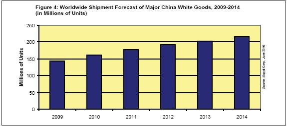 冰箱、空調(diào)和洗衣機(jī)的出貨量2010年將達(dá)到1.615億臺(tái),比去年的1.434億增長12.6%。這些產(chǎn)品是中國白色家電市場的關(guān)鍵組成部分。“白色家電”源于最初這類產(chǎn)品都是白色外觀,但現(xiàn)在也采用其它顏色。iSuppli公司追蹤的其它中國白色家電包括微波爐和電磁爐。