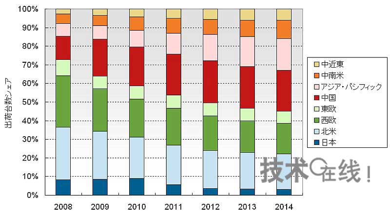 中國(guó)市場(chǎng)作為全球電視市場(chǎng)的消費(fèi)地的地位將會(huì)進(jìn)一步提高。2011年液晶電視供貨量將超過(guò)北美,2012年平板電視需求將超過(guò)5000萬(wàn)臺(tái)(圖1)。