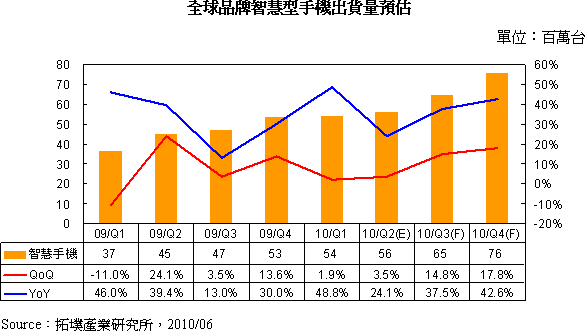 受到新興市場換機潮與新用戶的加入,以及成熟歐美市場新規(guī)格、新應(yīng)用的持續(xù)推出等因素激勵,拓墣產(chǎn)業(yè)研究所預(yù)估2010年全球品牌手機出貨量可望達13.29億支,較2009年成長11.7%,2010下半年出貨表現(xiàn)將優(yōu)于上半年,通訊產(chǎn)業(yè)研究中心謝雨珊副理分析,在智慧型手機快速低價化、iPhone 4上市之下,促使品牌廠相繼推出新款智慧型手機搶市,預(yù)估2010年全球智慧型手機出貨量為2.51億支,年成長率達37.9%,連續(xù)三年以超過30%以上高成長率攻占市場,2011年全球智慧型手機出貨量更挑戰(zhàn)4億支關(guān)卡,滲透率將從2010年的18.9%,攀升至2011年的27.6%,屆時每四款手機中即有一款是智慧型手機。