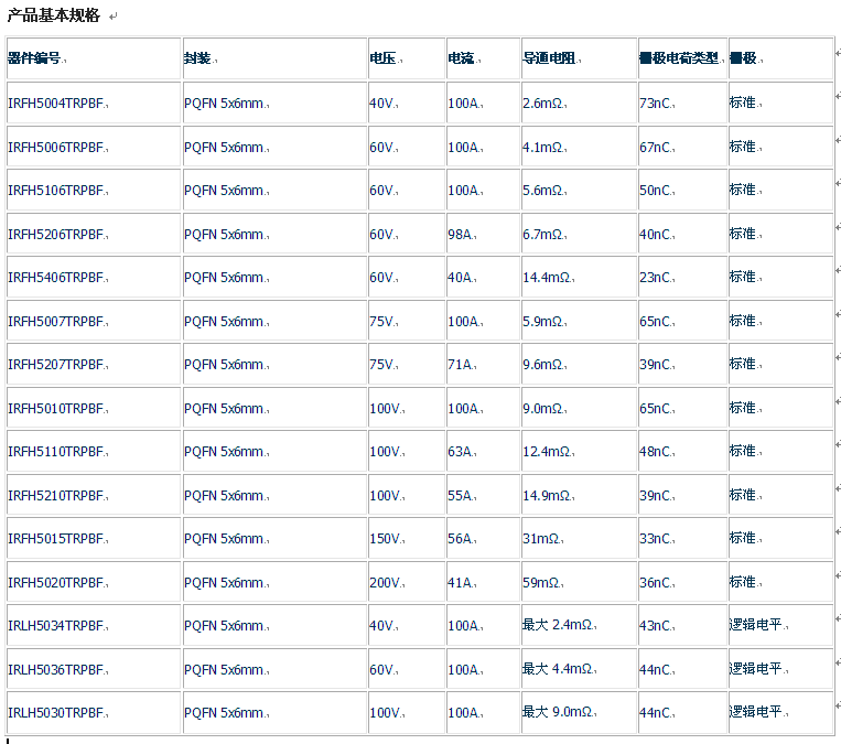 新的功率MOSFET采用了IR最新的硅技術來實現(xiàn)基準性能,適用于網(wǎng)絡和電信設備的DC-DC轉換器、AC-DC開關電源(SMPS)及電機驅動開關等開關應用。由于新器件滿足40V到250V的寬泛電壓,所以可提供不同水平的導通電阻(RDS(on))和柵極電荷(Qg),為客戶的特定應用提供優(yōu)化的性能和更低成本。