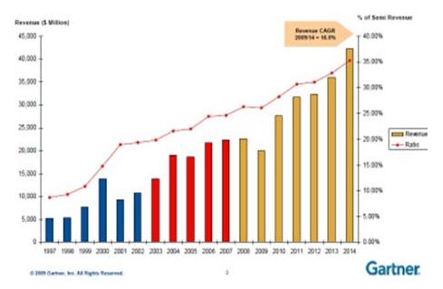 桉Gartner觀察,在明年的Q4時,僅TSMC,GlobalFoundries及三星加在一起,在45nm及以下制程的300mm硅片月產(chǎn)能達(dá)約280,000片,而2009 Q4時僅70,000片。今年TSMC與GlobalFoundries兩家計劃總投資達(dá)79億美元。