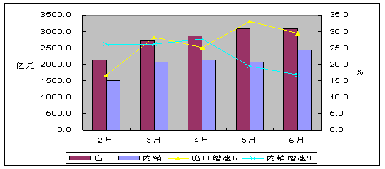 五、內(nèi)外銷保持同步增長(zhǎng),出口繼續(xù)快于內(nèi)銷。今年以來(lái),隨著外需不斷回暖,外銷出現(xiàn)持續(xù)增長(zhǎng),到5月底,全行業(yè)累計(jì)外銷增速開始超過(guò)內(nèi)銷,進(jìn)入6月份,外銷增速優(yōu)勢(shì)進(jìn)一步加強(qiáng),超過(guò)內(nèi)銷增速4個(gè)百分點(diǎn)。其中,內(nèi)銷產(chǎn)值11975.5億元,同比增長(zhǎng)27.2%;出口交貨值16647.1億元,同比增長(zhǎng)31.2%,高于產(chǎn)業(yè)平均增速1.7個(gè)百分點(diǎn)。產(chǎn)業(yè)出口依存度(58.1%)比去年同期提高0.7個(gè)百分點(diǎn),比前5個(gè)月下降0.6個(gè)百分點(diǎn)。