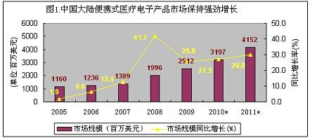 2005-2009年,中國大陸便攜式醫(yī)療電子產(chǎn)品市場呈現(xiàn)出加速增長勢態(tài),年復合增長率高達30.8%,幾乎沒有受到金融危機的影響。2009年市場總規(guī)模達到25.12億美元,增長速度達到25.8%占醫(yī)療電子產(chǎn)品總市場的53.2%。在便攜式醫(yī)療電子市場中,家用的占六成以上的份額,電子血壓計、便攜式血糖儀和電子助聽器占據(jù)了90%以上的銷售份額。由于目前市場處于普及的初級階段,中國人口基數(shù)大,國人健康意識的提升,整個便攜式醫(yī)療電子市場需要面對的是中國內(nèi)需市場,不存在市場飽和所謂的受金融危機影響。所以家用便攜式醫(yī)療電子產(chǎn)品市場前景非常好,便攜式、信息化、低功耗、低成本以及安全性是市場關(guān)注的熱點。展望未來,中國便攜式醫(yī)療電子市場前景非常誘人,在未來兩年,中國便攜式醫(yī)療電子產(chǎn)品市場規(guī)模年復合增長率可接近30%,2010年市場規(guī)模將接近32億美元,2011年會超過40億美元。(見下圖)。