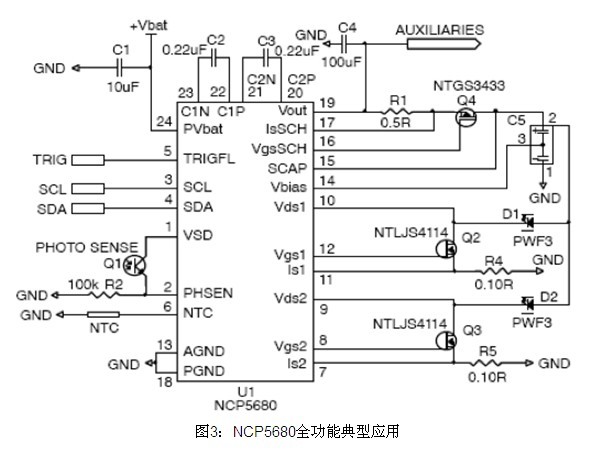 要在弱光下拍得高分辨率照片的數(shù)碼相機(jī)需要高亮度閃光。雖然白光LED能提供這個(gè)等級(jí)的光能,但需要比電池所提供的高出近400%的能量。以安森美半導(dǎo)體的NCP5680為例,它配合電池管理及超級(jí)電容來(lái)驅(qū)動(dòng)LED閃光至充分亮度,提供達(dá)10 A的大峰值電流。NCP5680的集成驅(qū)動(dòng)器還可管理超級(jí)電容,處理其他峰值功率功能,如變焦、自動(dòng)對(duì)焦、音頻、視頻、無(wú)線(xiàn)傳輸、GPS數(shù)據(jù)讀取及射頻(RF)放大,延長(zhǎng)電池使用時(shí)間又兼顧纖薄型設(shè)計(jì),節(jié)省開(kāi)發(fā)時(shí)間、電路板空間及元器件成本,見(jiàn)圖3。