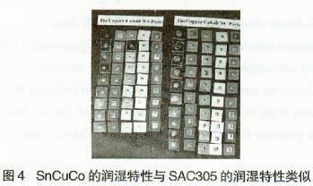 圖4顯示了SnCuCo合會(huì)的潤濕特性。它與存采用了各種涂覆方式的電路板上的SAC305具有非常相似的效果。這也就說明SnCuCo至少與SAC305一樣,在電路板潤濕方面具有相同的性能。
