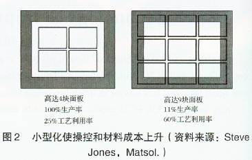 如果在一個方向持續(xù)地發(fā)生不正確的變化,在生產(chǎn)期間通過調(diào)整處理,可以很容易地得到糾正。但是在PCB生產(chǎn)過程中大多數(shù)的隨機變化是很難予以控制的。在實際生產(chǎn)過程中,每塊面板的尺寸可能會發(fā)生變化。當設(shè)計規(guī)定的允許誤差為100μm或者更大的時候,這可能不會是什么問題。然而,當把大量的功能放入一個很小的空間時這就意味著設(shè)計規(guī)定的允許誤差趨小。當裝配人員將PCB組件放置入較小形狀的面板上時,隨機變化現(xiàn)象將會大大的減少。但令人感到遺憾的是,這將涉及到大量的成本問題:為了滿足小型化面板的需要,需要更多的處置成本,材料的利用則會降為比較次要的問題(圖2)。